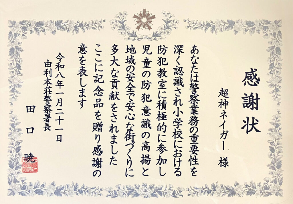 ■令和8年1月21日(水)由利本荘警察署において、小学校における防犯教室への積極的な参加と地域の安全安心な街づくりへの貢献により、超神ネイガーが田口警察署長から感... -