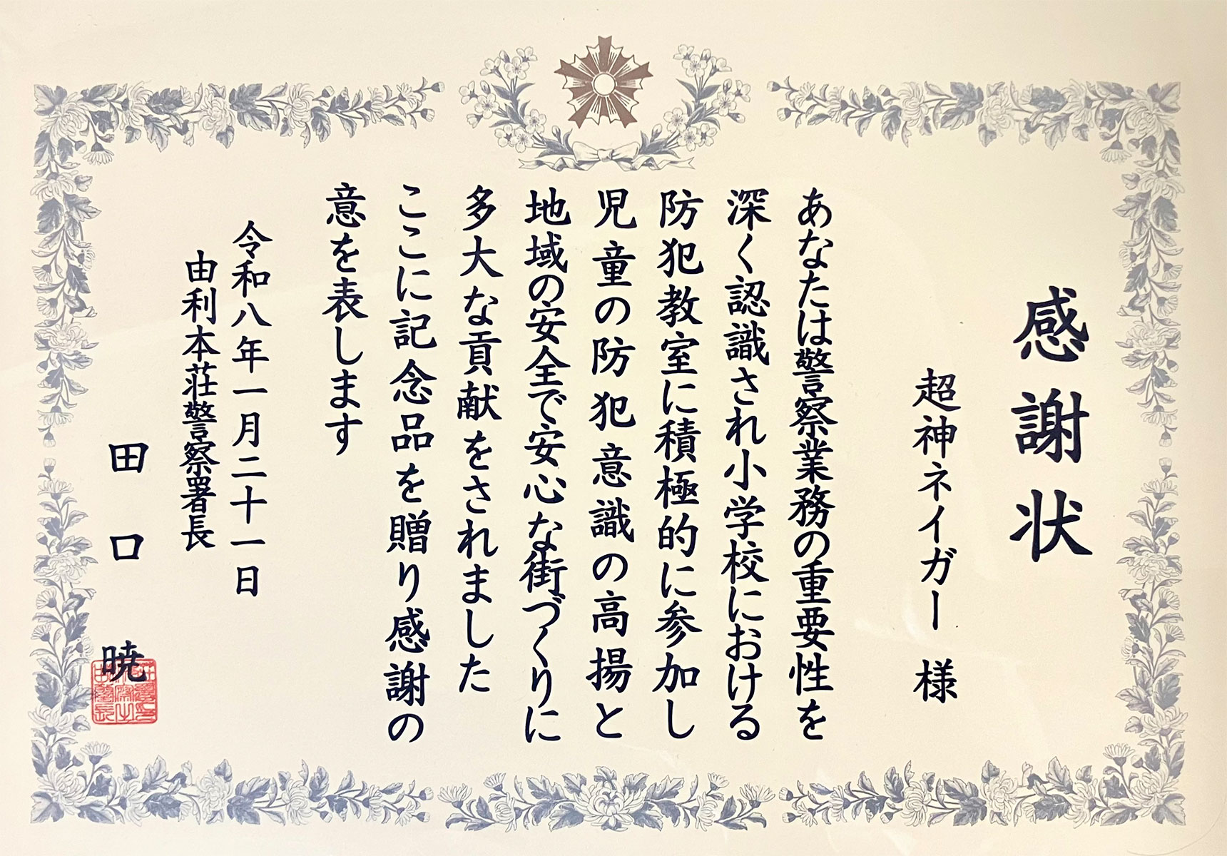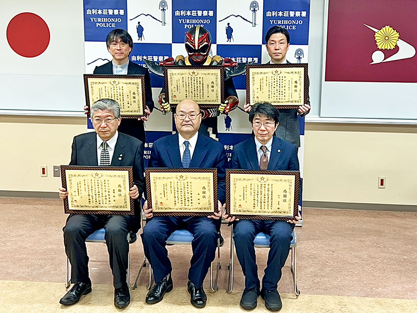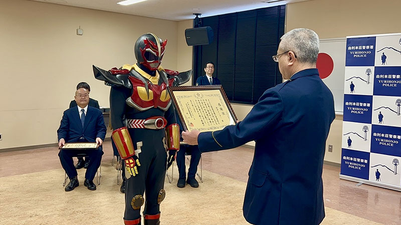 由利本荘警察署において、小学校における防犯教室への積極的な参加と地域の安全安心な街づくりへの貢献により、超神ネイガーが田口警察署長から感謝状をいただきました。